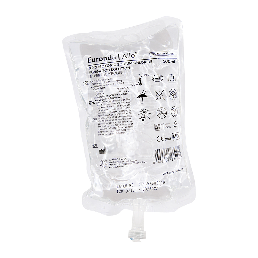 Soluzione isotonica sterile (sodio cloruro) adatta per irrigare il sito chirurgico e contestualmente raffreddare gli strumenti rotanti durante le operazioni o gli strumenti oscillanti durante la chirurgia piezoelettrica. La soluzione è studiata appositamente per non alterare l’equilibrio osmotico extracellulare durante le procedure. Dopo l’intervento, può essere utilizzata per rimuovere sangue e frammenti di tessuti, per lavare e irrigare le ferite. <b>Vantaggiosa:</b> progettata per essere utilizzata con una pompa peristaltica, si adatta a tutti i modelli di physiodispenser. Rispetto ai classici flaconi, la sacca risulta essere più semplice da utilizzare e meno fragile. <b>Versatile:</b> viene utilizzata sia per il raffreddamento degli strumenti chirurgici rotanti o oscillanti durante gli interventi odontoiatrici, sia per irrigare il sito chirurgico, eliminando saliva, sangue ed eventuali altri residui. <b>Sicura:</b> la soluzione salina Euronda è testata per un contatto sicuro con tessuti, ossa e dentina per un tempo prolungato fino a 24 ore. Dispositivo medico classe IIa Confezione: 15 sacche da 500 ml cad.